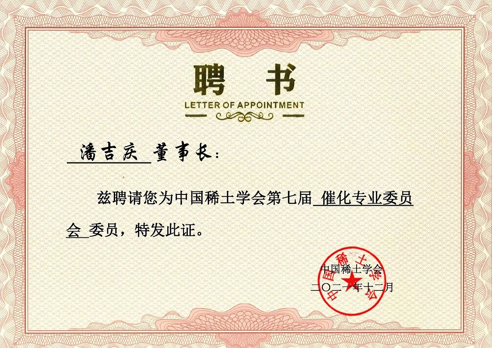 【概要描述】近日,公司董事長潘吉慶先生被中國稀土學會聘為“第七屆催化專業(yè)委員會委員”。